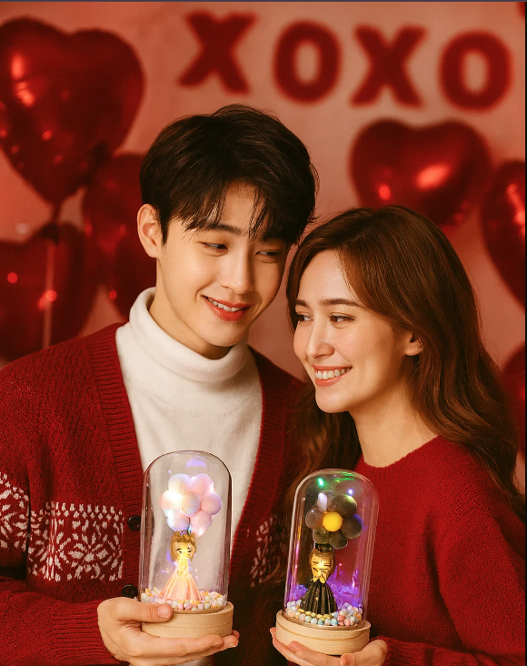 Flor decorativa con figura de princesa y luz LED integrada, presentada en cúpula transparente con base. Venta por mayoreo CQ-02006