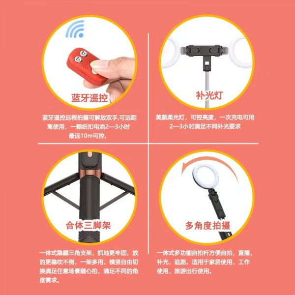 Palo selfie 3 en 1 con luz LED y control remoto Bluetooth. Funciona como trípode y soporte para grabar videos, selfies o transmisiones en vivo con iluminación perfecta Venta al por mayor 60881