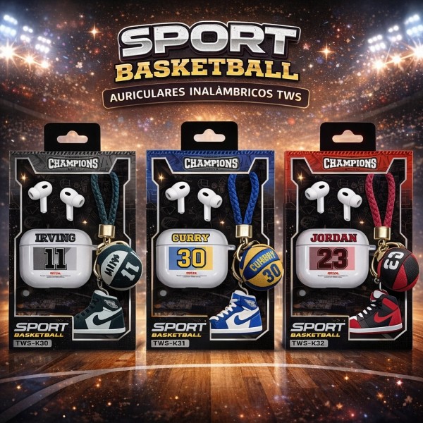 | Auriculares TWS con diseño deportivo estilo basketball, estuche decorado y llavero colgante incluido. Ideales para regalos y venta por mayoreo. |