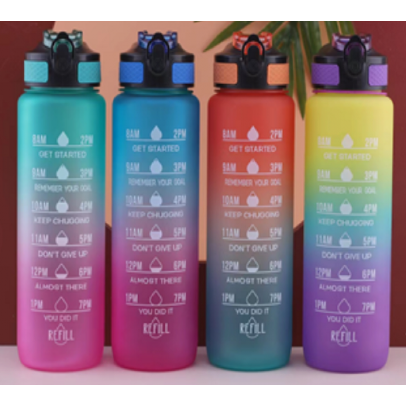 Botella deportiva de 1 litro colores degradados y frases motivacionales con marcadores de tiempo para el control de hidratación diaria. Venta por mayoreo ZE-0740