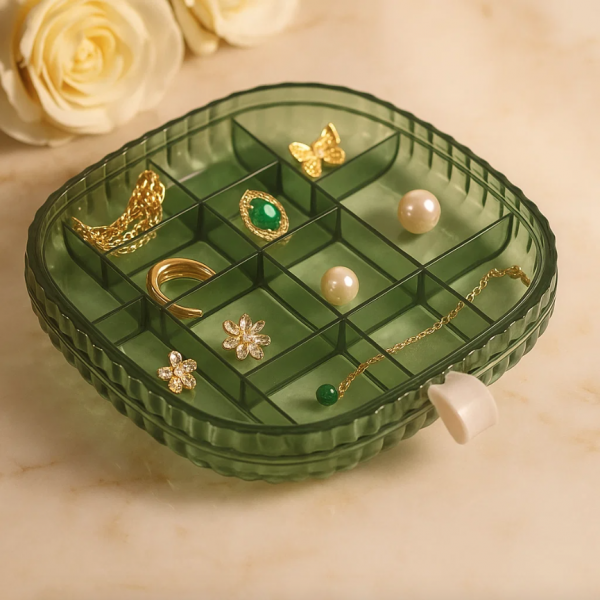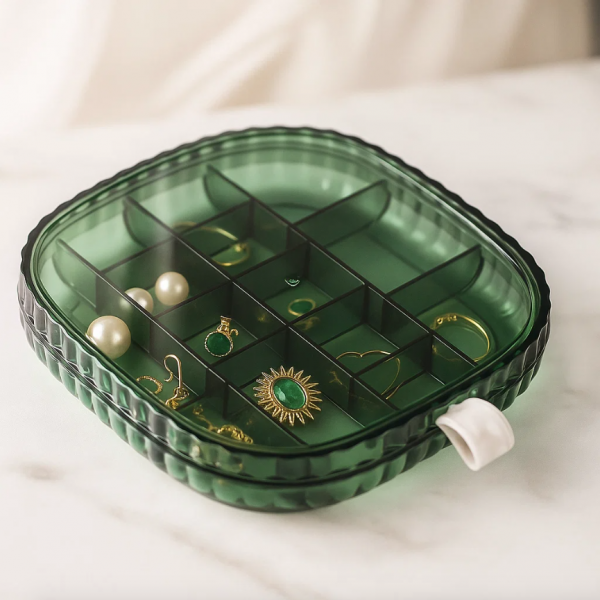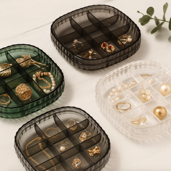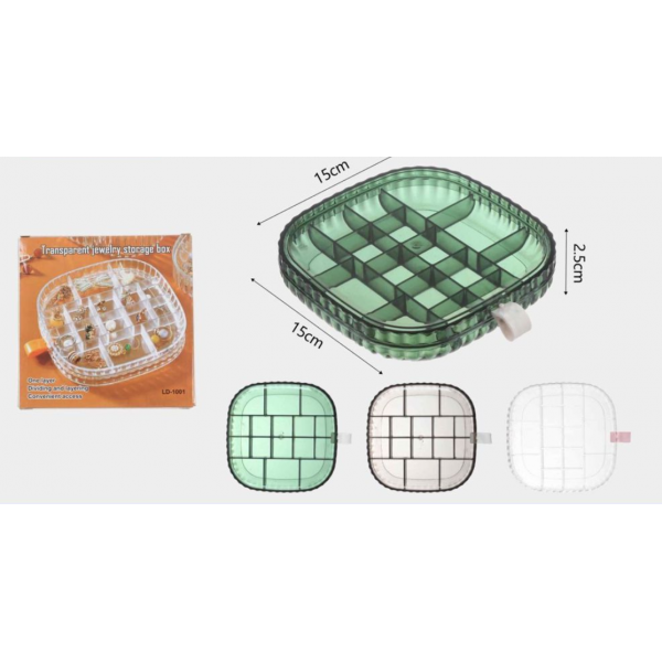 Caja organizadora de una sola capa con 15 compartimentos, ideal para joyería, bisutería y pequeños accesorios. De plástico, diseño moderno y tamaño compacto 15×15×2.5 cm. Venta por mayoreo 11477