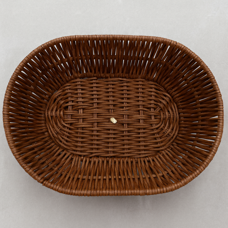 Canasta plástica color café tipo mimbre, diseño ovalado decorativo, ideal para pan o frutas, modelo GG01-2, venta por mayoreo