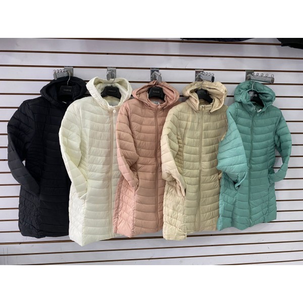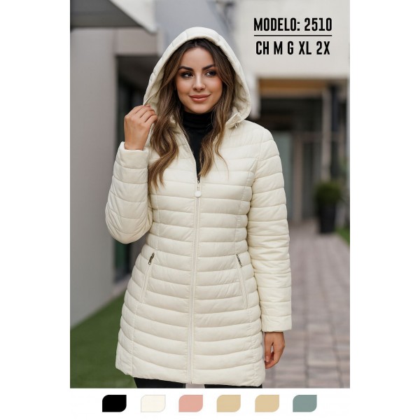 Chamarra larga acolchada para dama diseño térmico, ligera y cómoda. Incluye gorro integrado, cierre completo y bolsas laterales. 2 por talla de cada color y Doble negro Venta al por mayor 2510