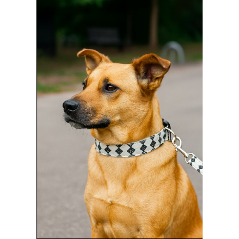 Collar con correa para perro en diseño geométrico blanco y negro. Fabricado con materiales resistentes y hebilla metálica de seguridad. Ajustable, cómodo y duradero, ideal para paseos seguros con tu mascota. Venta por mayoreo.