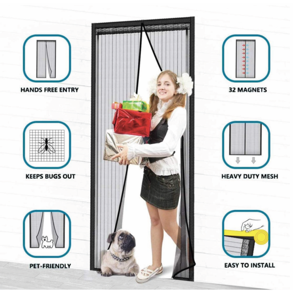 Cortina magnética para puerta, ideal para mantener los insectos fuera mientras permite una entrada y salida sin manos gracias a sus 32 imanes integrados. Fabricada con malla resistente de alta calidad, es fácil de instalar y perfecta para hogares con mascotas. Su diseño moderno se adapta a cualquier ambiente interior. ¡Solución práctica y estética para el hogar!