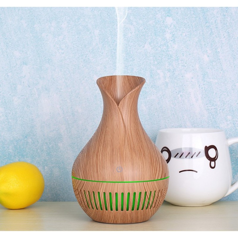 Difusor de aceites esenciales con tecnología ultrasónica, ideal para aromaterapia, relajación y humidificación del ambiente. Su diseño en forma de florero con acabado tipo madera lo hace perfecto para decorar espacios como salas, oficinas, recámaras o spas. Incluye luces LED de colores cambiantes y se activa fácilmente con un solo botón.