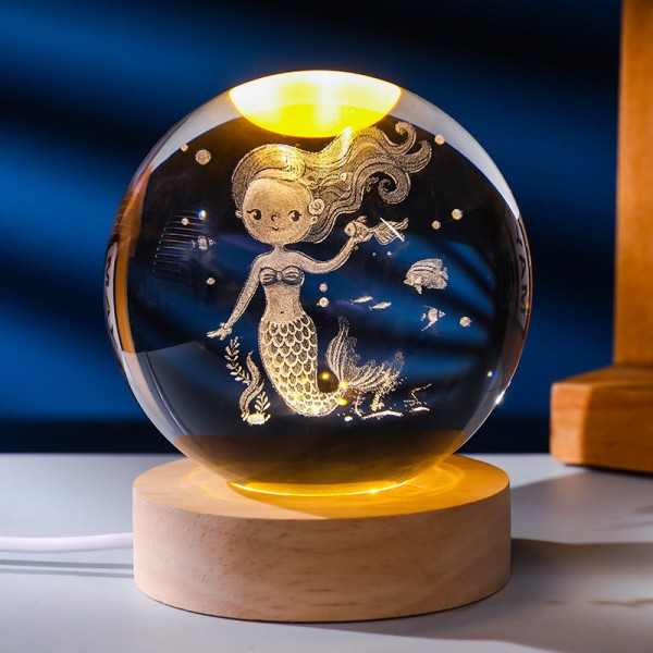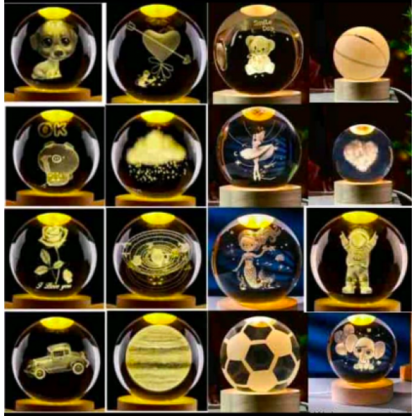 Etiquetas: Esferas de cristal con grabado 3D y base LED multicolor. Diseños variados: corazones, planetas, flores, ositos y más. Ideal para regalar o decorar.