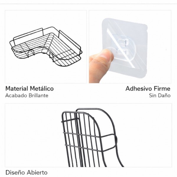 Estante esquinero metálico con diseño funcional y resistente, ideal para organizar artículos de baño, cocina o lavandería sin necesidad de perforar. por Mayoreo P-11983