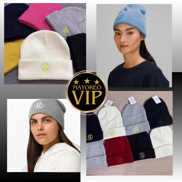 Gorro unisex tejido con logo tipo Lululemon. Varios colores ideales para invierno o uso diario. Venta al por mayor