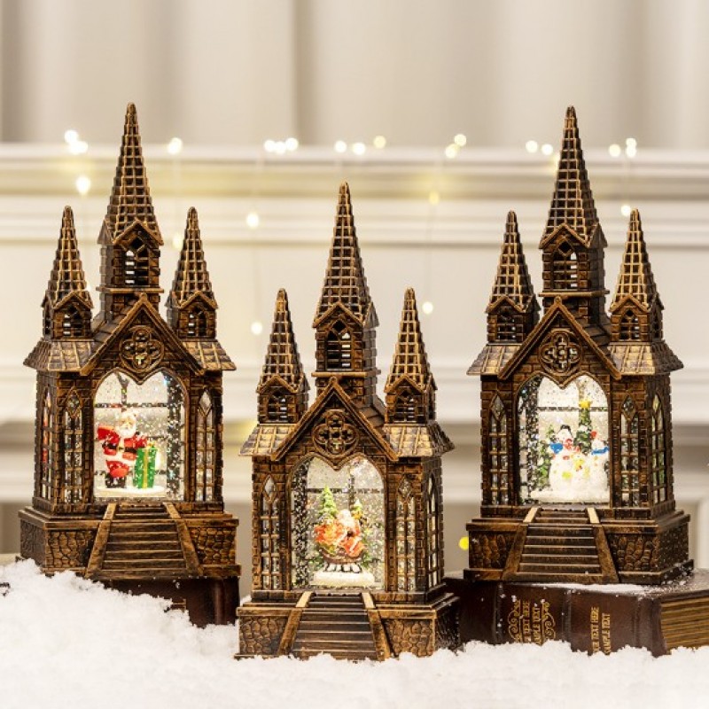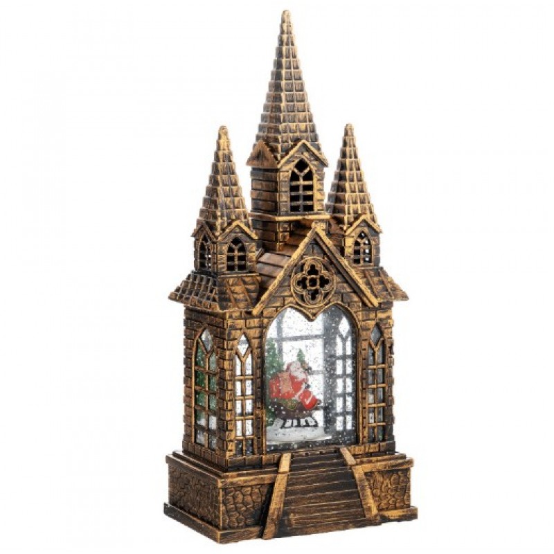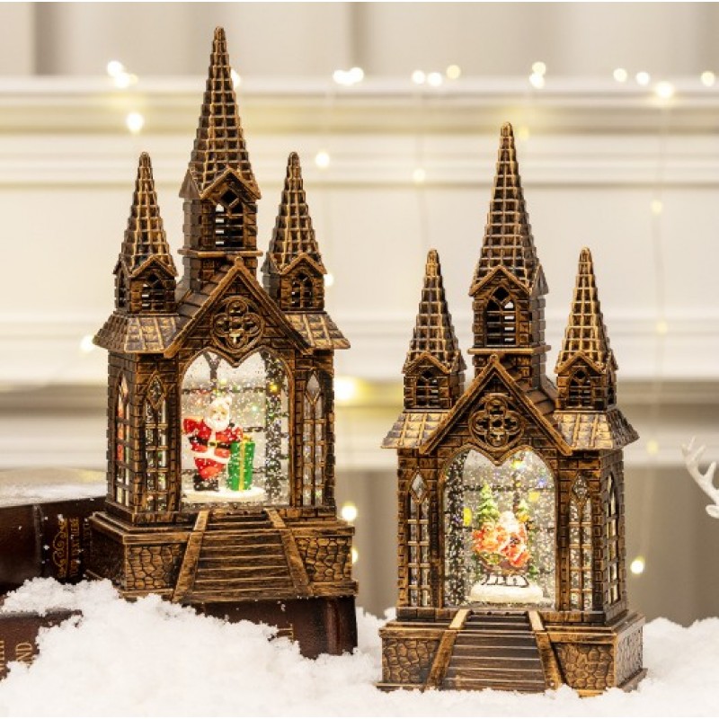 Iglesia navideña decorativa estilo vintage con Santa Claus y árbol de Navidad, luces LED y efecto de nieve. diseño diferentes Por Mayoreo D-21654
