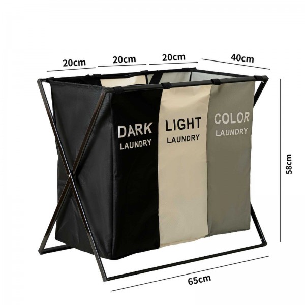 Cesta de almacenamiento de lavandería de tres compartimentos Negro + Gris + Beige + Tela. Venta por mayoreo