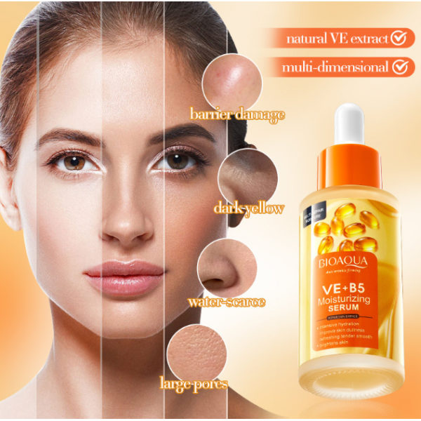 Suero facial Bioaqua VE + B5 hidratante y suavizante, fórmula iluminadora que ayuda a reducir poros, mejorar la textura de la piel, controlar la resequedad, aportar luminosidad natural y unificar el tono, Mayoreo NO.BQY17901