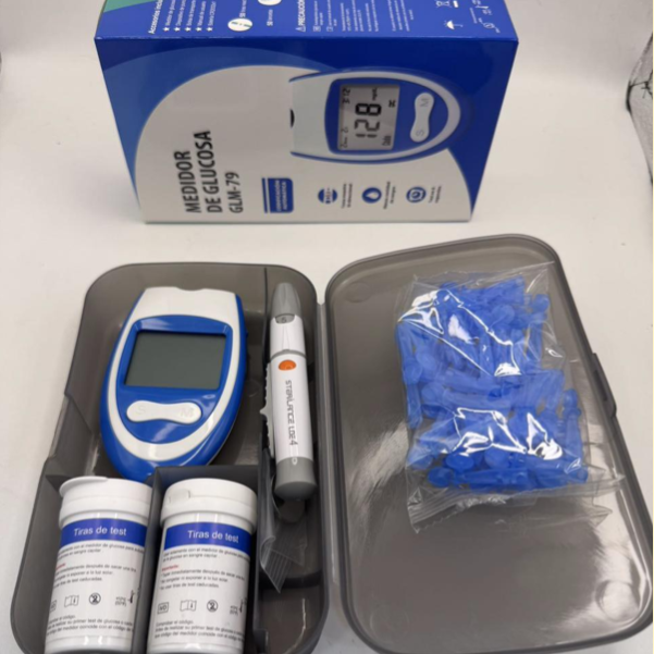 Medidor de glucosa GLM-79 ideal para el monitoreo de niveles de azúcar en sangre. Este kit incluye el medidor, tiras de test y lancetas, todo en un práctico estuche.