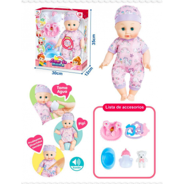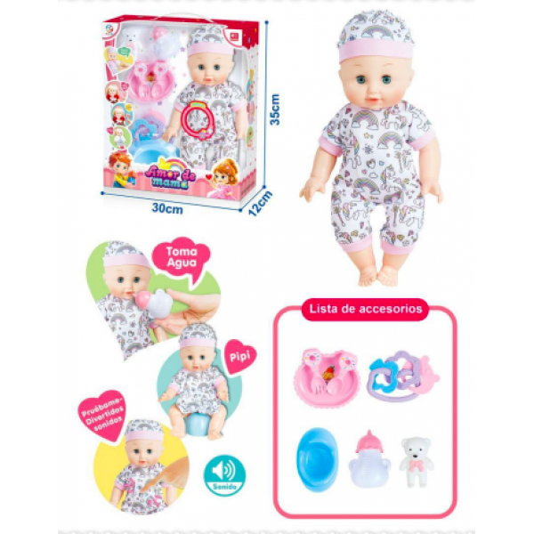 Etiquetas: muñeca bebé, muñeca interactiva, muñeca que toma agua, muñeca que hace pipí, muñeca con accesorios, muñeca con sonidos, juguete educativo, muñeca para niñas, juego de roles
