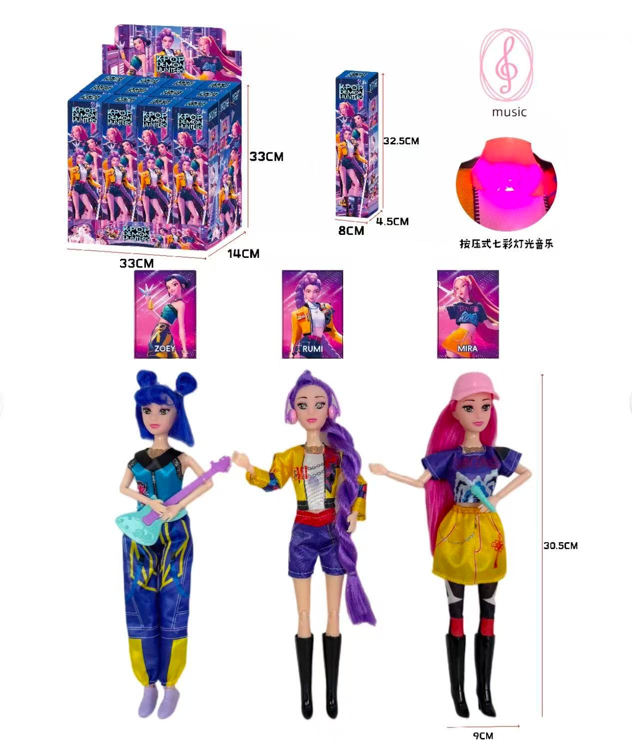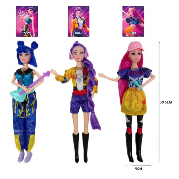 Muñeca KPOP de 30.5 cm con música y luz. Zoey, Rumi y Mira. Incluye caja individual de 32.5 cm para exhibición. Ideal para regalo, colección y venta en jugueterías. Venta al por mayor