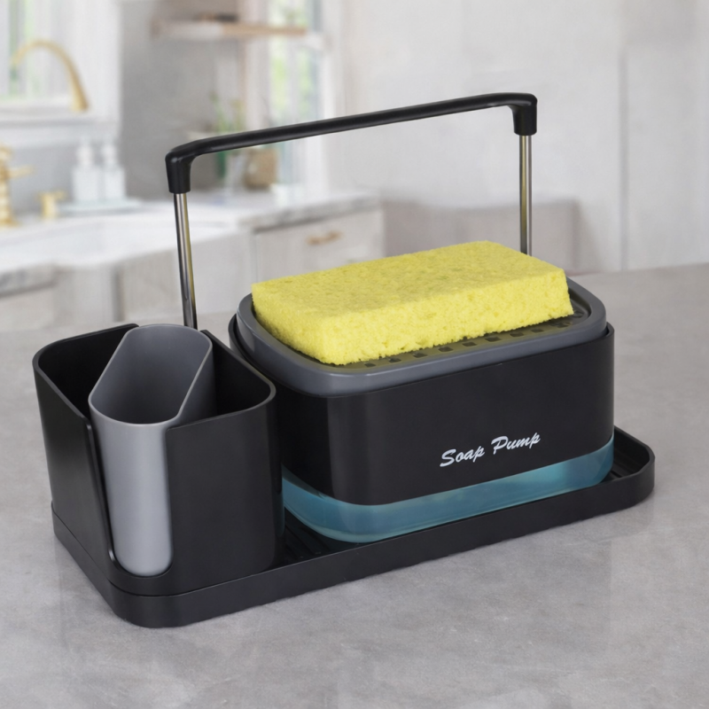 Organizador para fregadero diseñado para mantener el área de la cocina limpia y ordenada. Incluye dispensador de jabón integrado, soporte superior para esponja, compartimentos laterales para utensilios y charola base para escurrir el exceso de agua. Su diseño compacto y funcional optimiza el espacio alrededor del fregadero, facilitando el acceso a los artículos de limpieza diaria. Ideal para cocinas modernas, departamentos y venta por mayoreo.