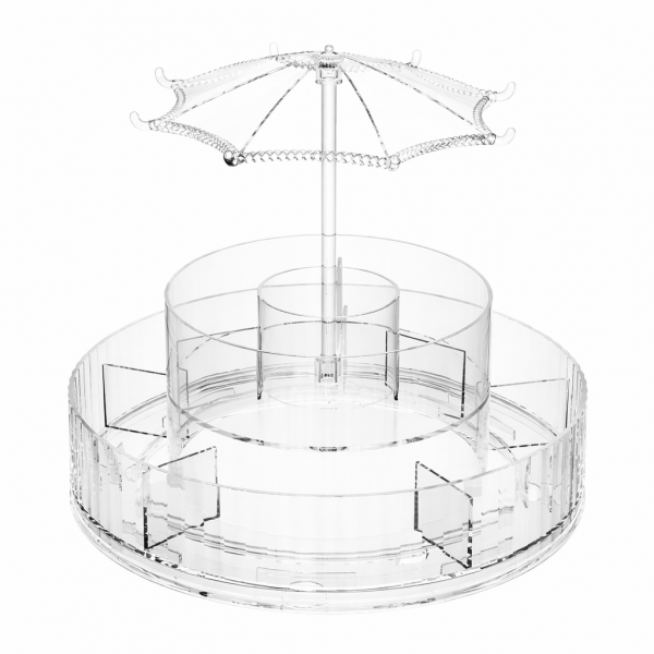 Organizador giratorio de 360 grados diseñado para almacenar y exhibir cosméticos de forma práctica y elegante. Cuenta con doble nivel circular y múltiples compartimentos que permiten organizar maquillaje, cremas, perfumes, brochas y accesorios. Incluye eje central giratorio que facilita el acceso a todos los productos sin mover el organizador. Su diseño decorativo lo convierte en un complemento ideal para tocadores, baños y áreas de belleza. Producto funcional y visualmente atractivo, ideal para venta por mayoreo.