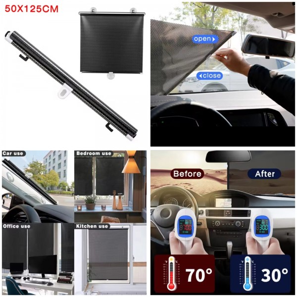 Etiquetas: Parasol retráctil para auto medida 50x125 cm, ideal para bloquear rayos solares, reducir calor y proteger el tablero y asientos. Fácil de instalar, enrollable y reutilizable para parabrisas y ventanas. Perfecto para uso diario en coche, oficina u hogar. Venta por mayoreo y el código del producto RSD-471