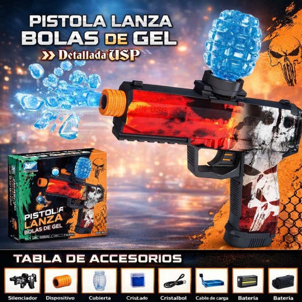 Pistola lanza bolas de gel eléctrica con diseño tipo USP, ideal para juegos recreativos y actividades al aire libre. Incluye cargador superior transparente, batería recargable, cable de carga, silenciador decorativo y munición de bolas de gel hidratables. Fabricada en plástico resistente con disparo automático y semiautomático. Producto perfecto para venta por mayoreo en jugueterías, tiendas de hobbies y distribuidores.