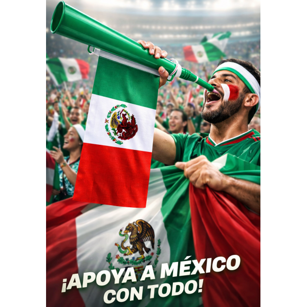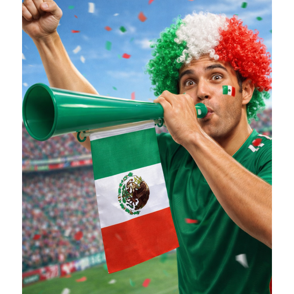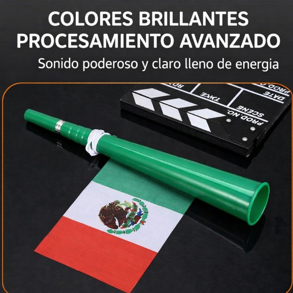 Etiquetas: Trompeta de fútbol color verde, ideal para animar partidos, incluye cordón para colgar y diseño con bandera de México. por Mayoreo 2159-10, trompeta futbol, mundial 2026, vuvuzela, corneta deportiva, animacion futbol, fiesta futbolera, mayoreo deportes