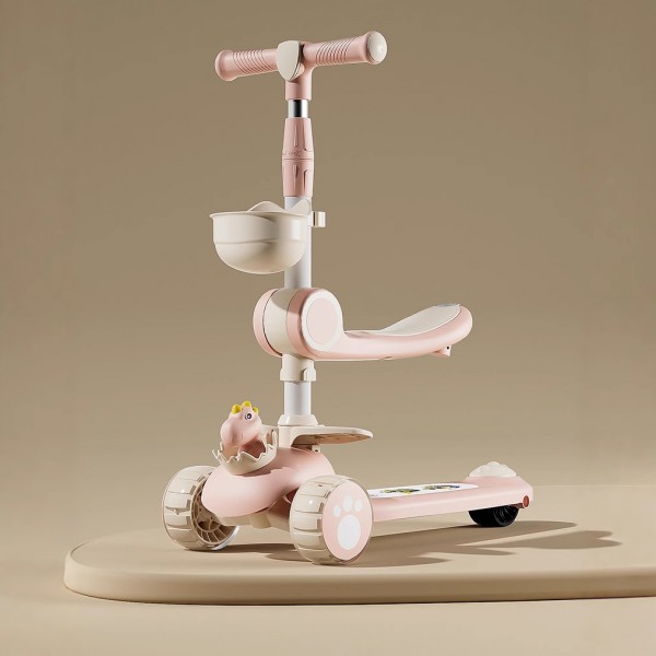 Etiquetas: Scooter infantil 3 en 1 con asiento desmontable, canastilla, diseño de dinosaurio, ruedas LED y altura ajustable | Patín seguro y estable para niños