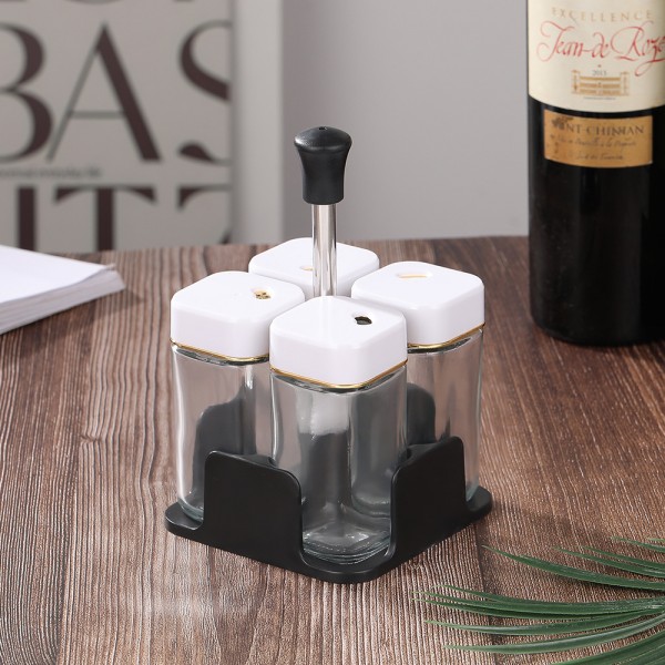 Etiquetas: set de especieros, especieros de vidrio, frascos para condimentos, porta especias, especiero elegante, especiero con base, especieros para cocina, especiero 4 piezas, especiero con tapa blanca, especiero con agarradera
