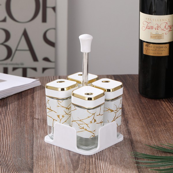 Set de especieros de vidrio con tapas blancas y detalles dorados, ideal para sal, pimienta y condimentos. Incluye base organizadora con agarradera central para fácil transporte Venta al por mayor 16071-7