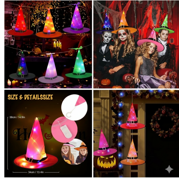 Etiquetas: sombrero de bruja, sombrero con luz, gorro de bruja, disfraz de halloween, accesorio para fiestas, luces LED, sombrero con luces, decoración de halloween, disfraz para niños