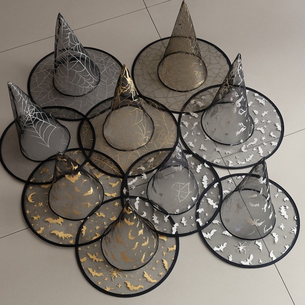 Sombreros de bruja decorativos de malla con diferentes diseños – Modelos surtidos – Accesorio ideal para disfraces y decoración de Halloween- Por Mayoreo 1985-12