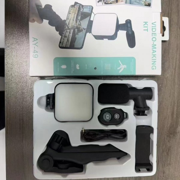 Etiquetas: kit de grabación, kit para vlogger, luz led para celular, micrófono para grabación, soporte para celular, trípode con luz, equipo para vlogs, accesorio para streaming, kit ay-49