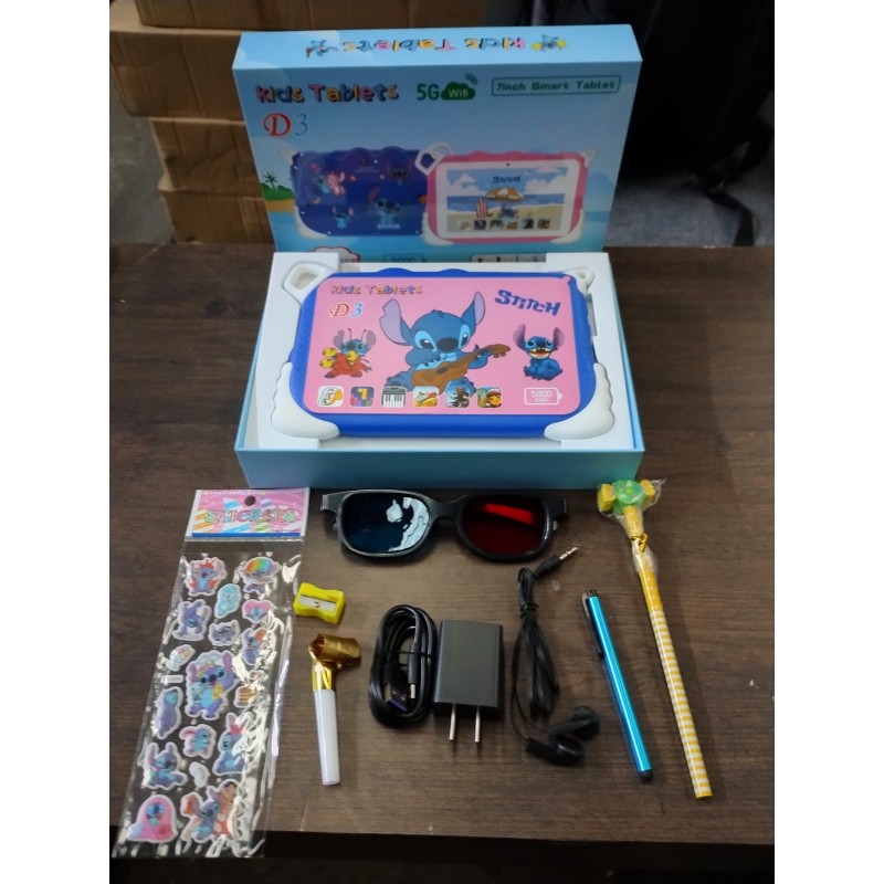 Tablet Kids Stitch con Android 13 actualizable y memoria de 250GB. 5 modelos infantiles. Incluye cargador, audífonos, lápiz inteligente para Android, stickers y lentes 3D. Ideal para aprendizaje, juegos. Venta por mayoreo