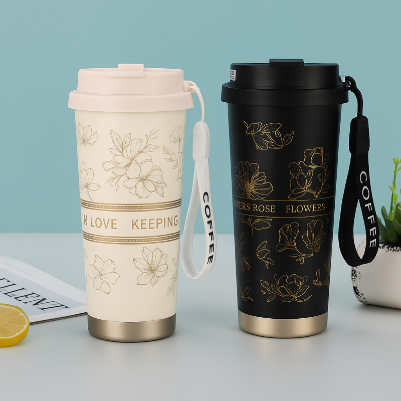 Etiquetas: Termo de acero inoxidable con diseño floral y correa portátil – Botella térmica con tapa hermética para café, té y bebidas de 500ml, Por Mayoreo BZ818, termo floral, termo acero inoxidable con correa, botella térmica con tapa, termo café y té portátil, termo elegante de viaje, termo con diseño de flores