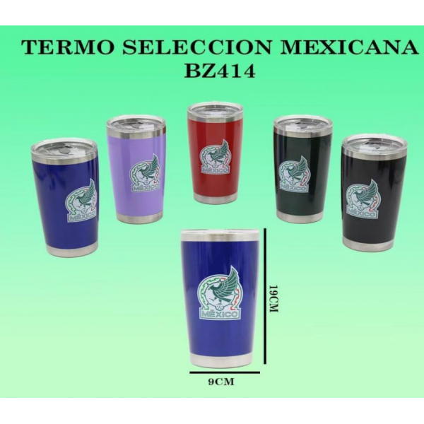 Termo de acero inoxidable de 20 oz con diseño de la Selección Mexicana, ideal para bebidas frías o calientes. Venta por mayoreo BZ414